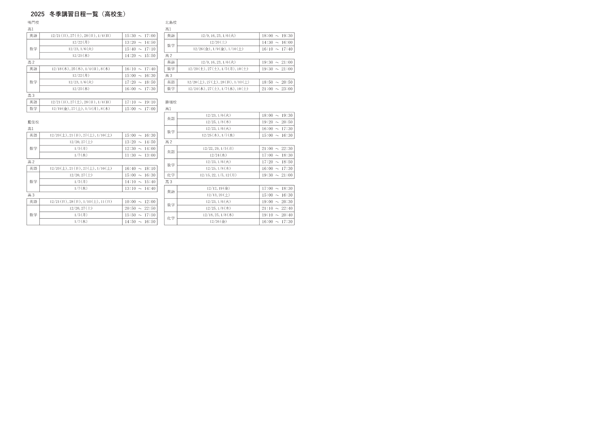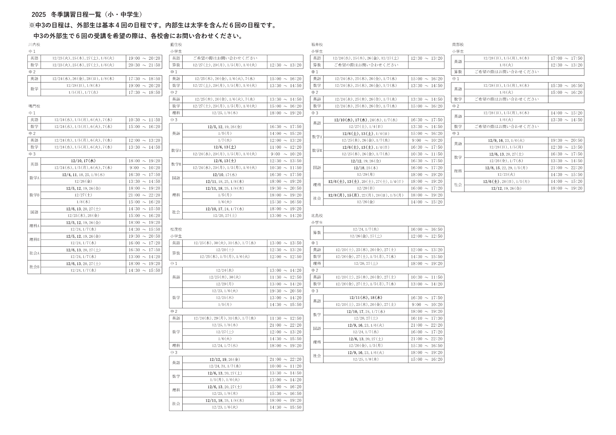 ※冬期講習の料金はこちらをご覧ください。ただし,学年や科目により2回となっている場合は表示料金の半額となります。